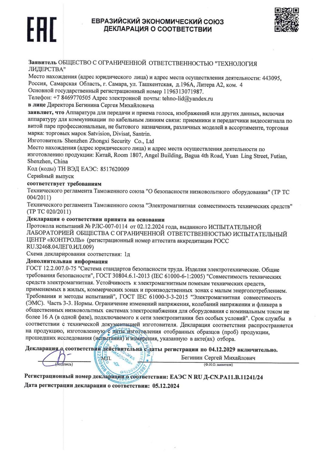 Документ, подтверждающий, что видеокамеры Satvision и Divisat соответствуют требованиям, указанным в соответствующих Технических регламентах Таможенного союза.