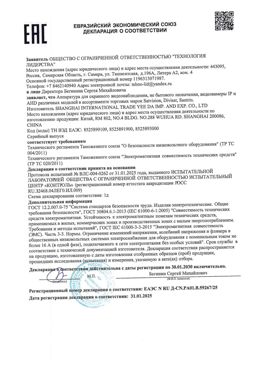 Декларация о соответствии на IP и AHD видеокамеры бренда Satvision (ТР ТС 004/020)