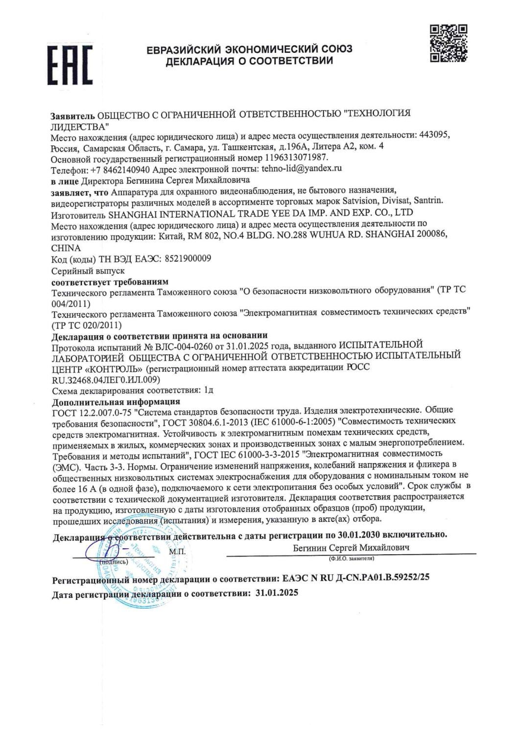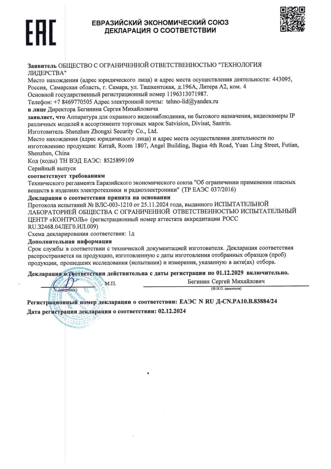 Декларация о соответствии на IP видеокамеры RU-серии бренда Satvision (ТР ЕАЭС 037)