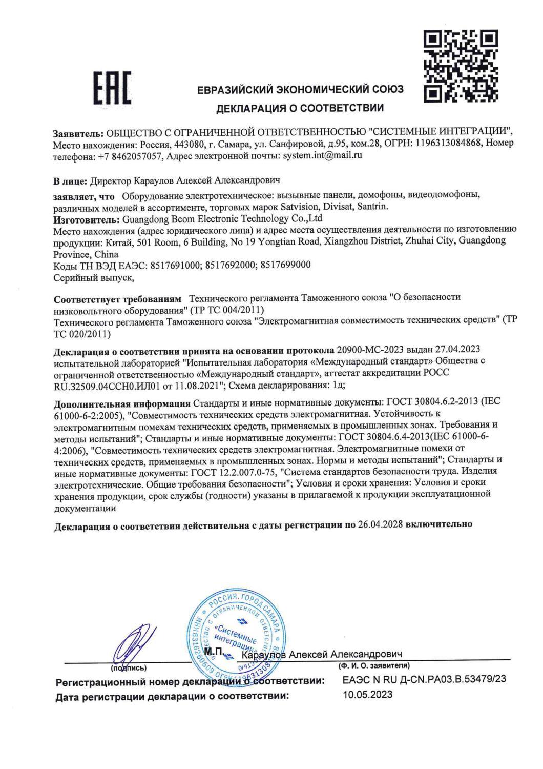 Декларация о соответствии на видеодомофоны и вызывные панели бренда Satvision (ТР ТС 004/020)