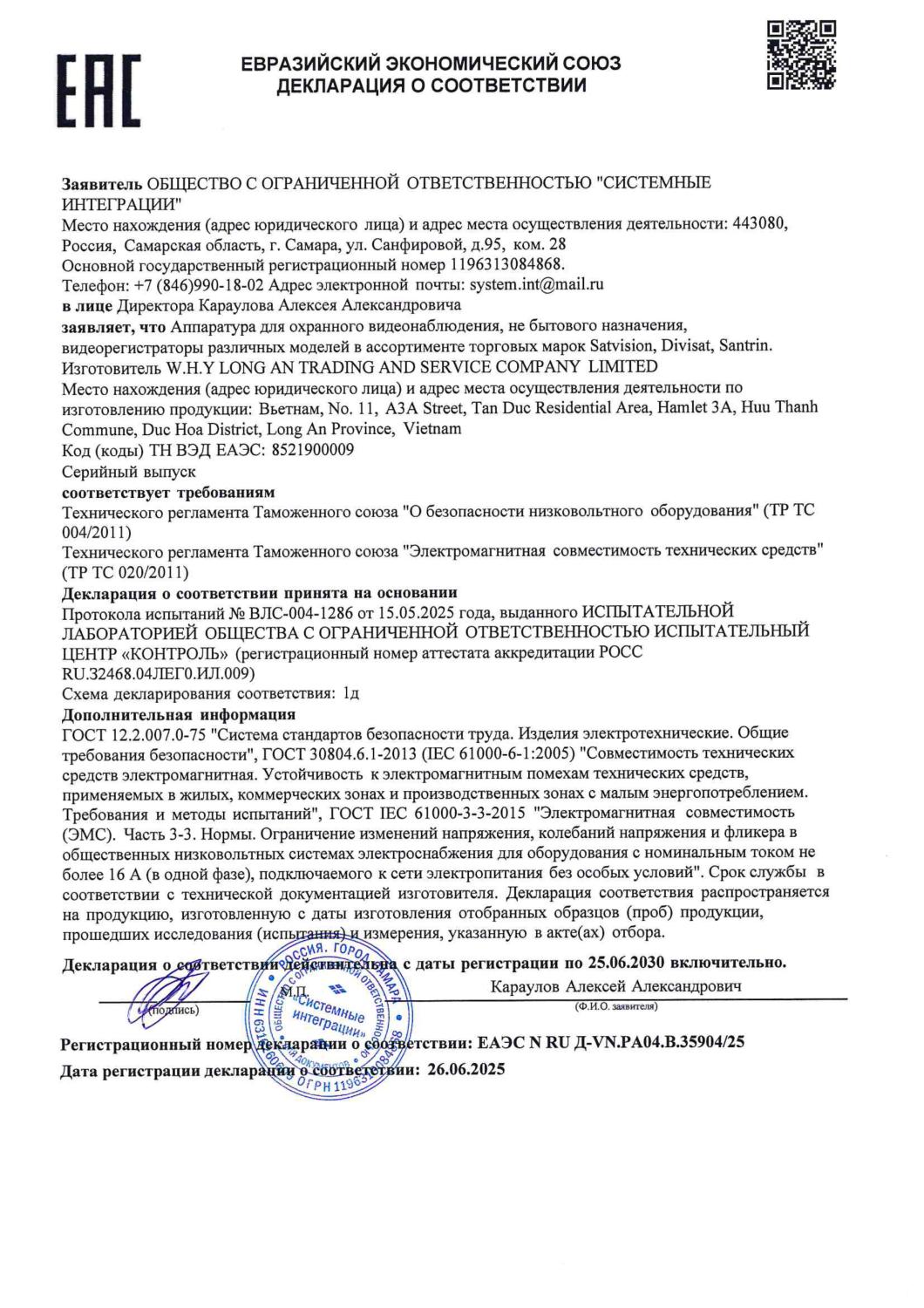 Декларация о соответствии на видеорегистраторы Xmeye бренда Divisat (ТР ТС 004/020)