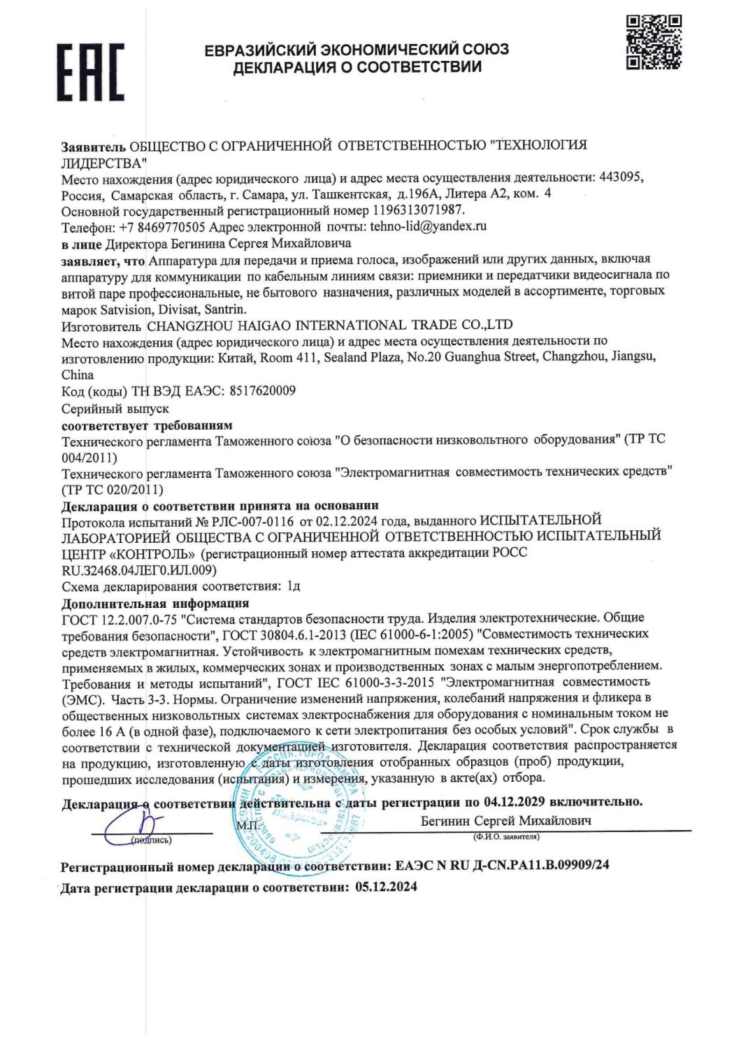 Декларация о соответствии на приемопередатчик SVT-409AH бренда Satvision (ТР ТС 004/020)