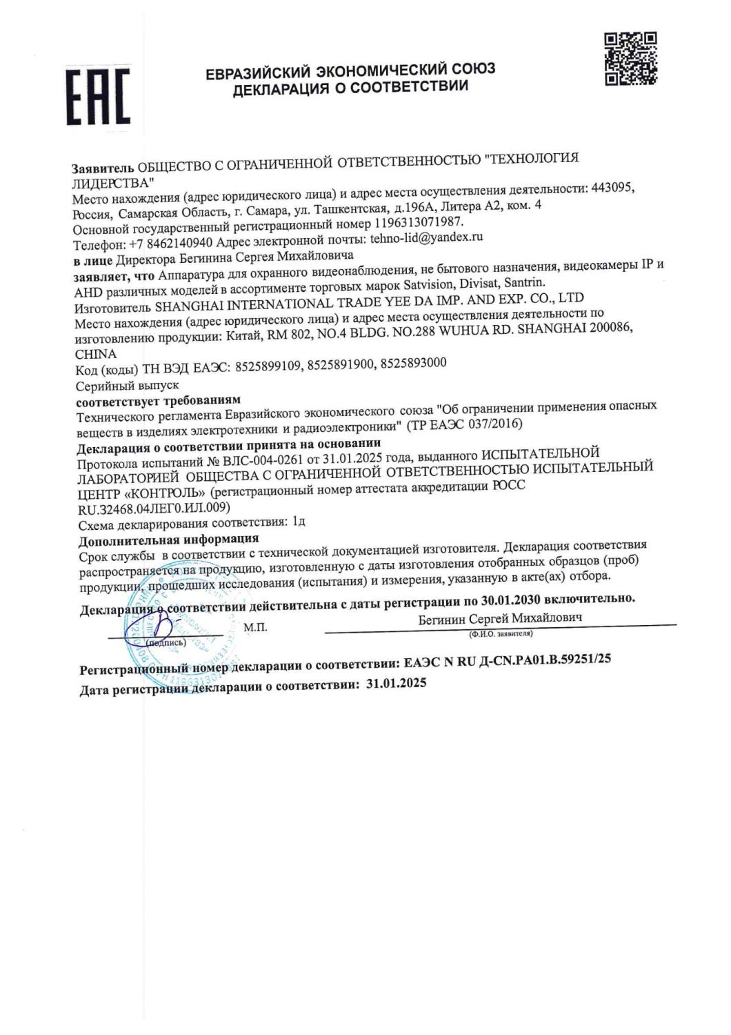 Декларация о соответствии на IP и AHD видеокамеры бренда Satvision (ТР ЕАЭС 037)
