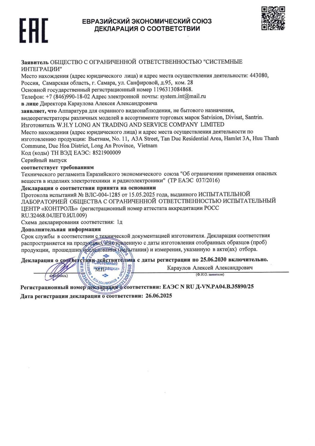 Декларация о соответствии на видеорегистраторы 1-й серии бренда Satvision (ТР ЕАЭС 037)