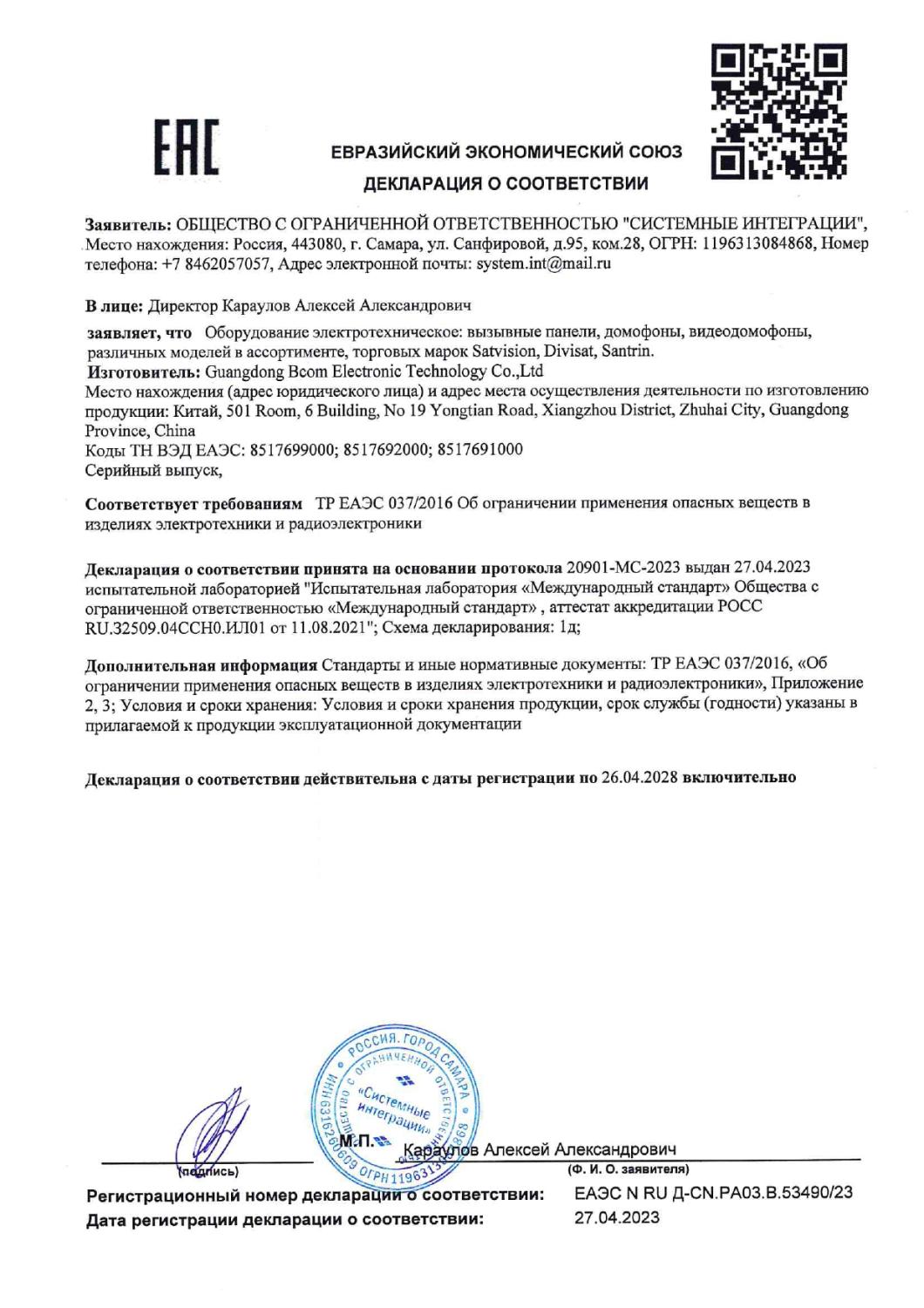 Декларация о соответствии на видеодомофоны и вызывные панели бренда Satvision (ТР ЕАЭС 037 189.4 кб